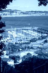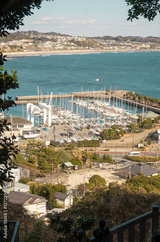 Ocean view, panoramic view on the blue waters of the Sugami Bay and Shonan Port with boats and view on Kamakura at daytime in winter on Enoshima in Japan.