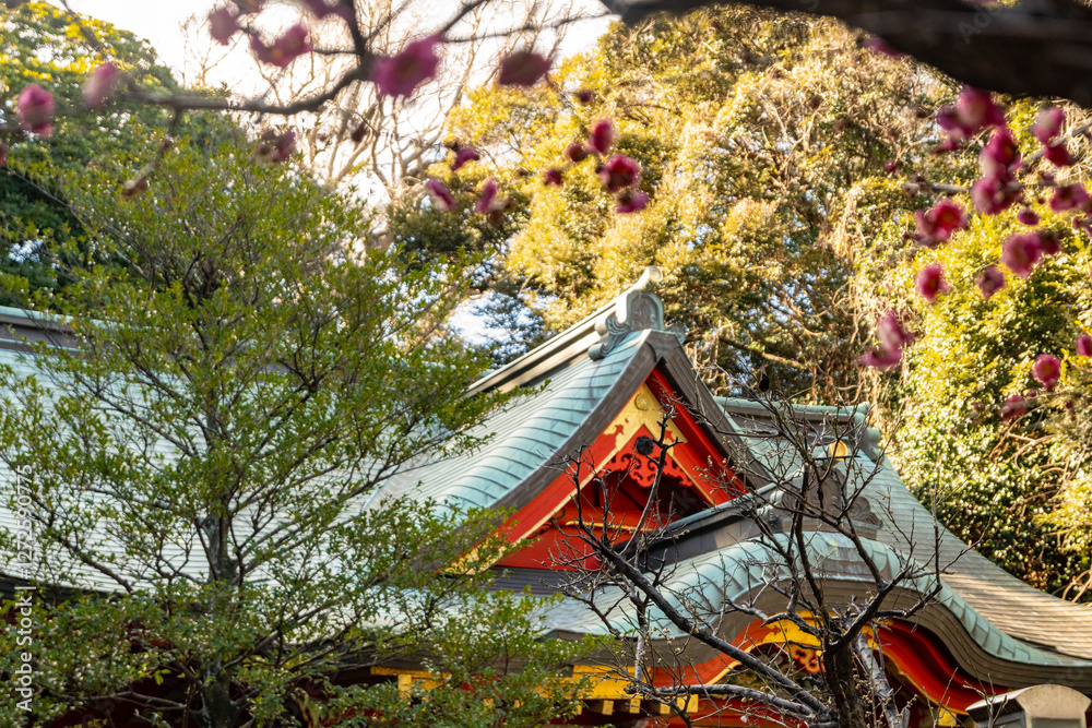 Japanese temple, the building exterior of a red shrine framed by the pink flowers of a blooming plum tree in early sprong at daytime on Enoshima in Japan.