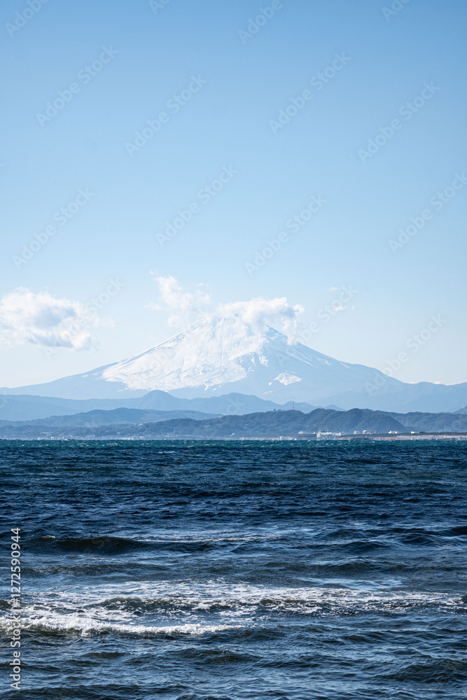 Mount Fuji, panoramic ocean view on the Japanese volcano Mt Fuji from Enoshima Island at daytime in Japan with blue sky and space for text.