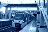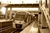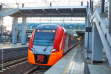 Beautiful railway station with modern red commuter train .