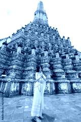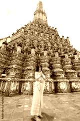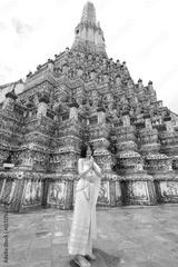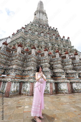 Young Asian woman in traditional Thai costumes at Wat Arun Ratchawararam.