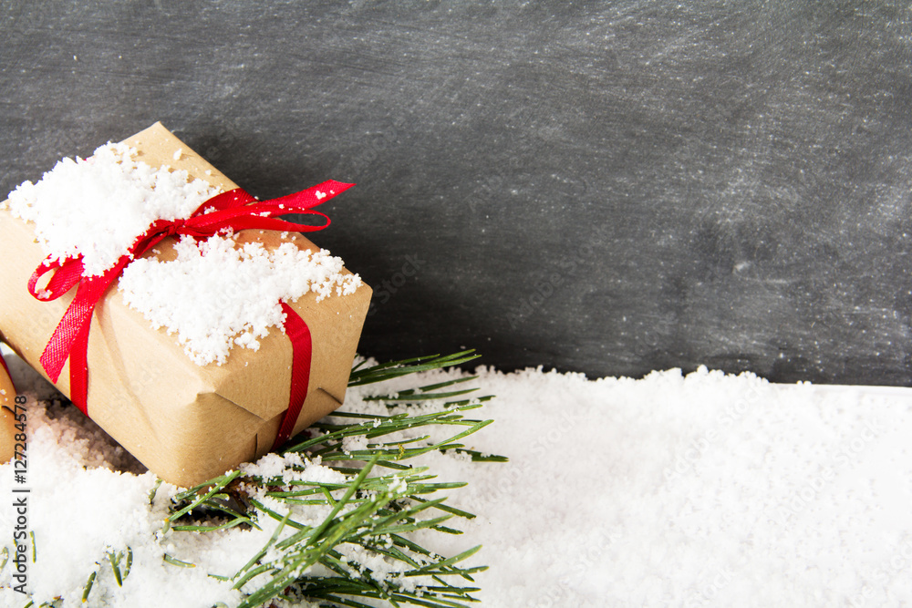 Christmas presents in snow against a blackboard