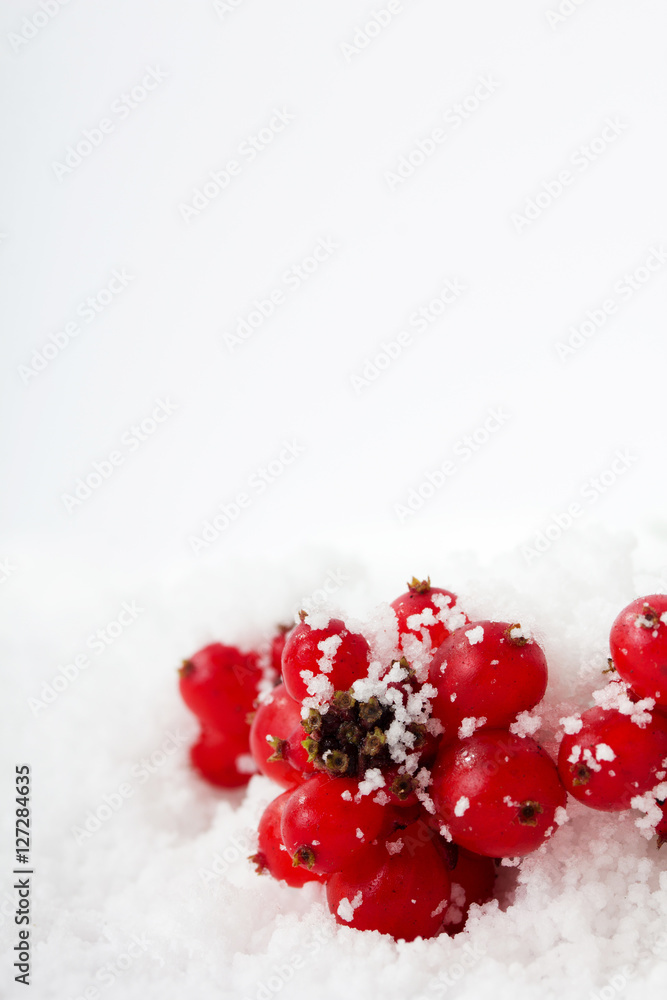 Bright red berries covered in white snow