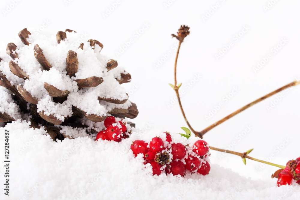 Pine cone and red berries in white snow