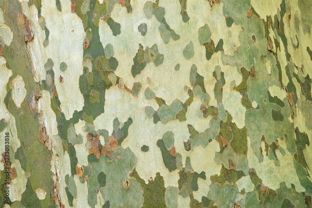 Close-up of the camouflage-like bark of the plane tree in Southern France. Tree bark texture background.
