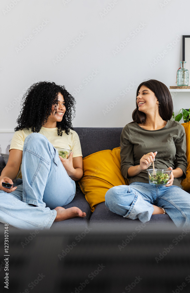 Two happy female friends enjoying a healthy meal while watching television together, representing a relaxed and enjoyable leisure activity. Female friendship and youth concept