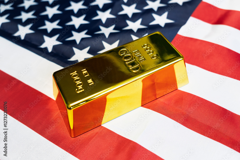 American Finance Concept - Gold Bar in front of US Flag. gold reserves. shining golden bullions on the united states of america flag background