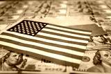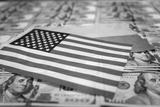 American and Ukrainian flags, a pack of American dollars. Support and help from USA to Ukraine. Earning money in the Ukrainian war.