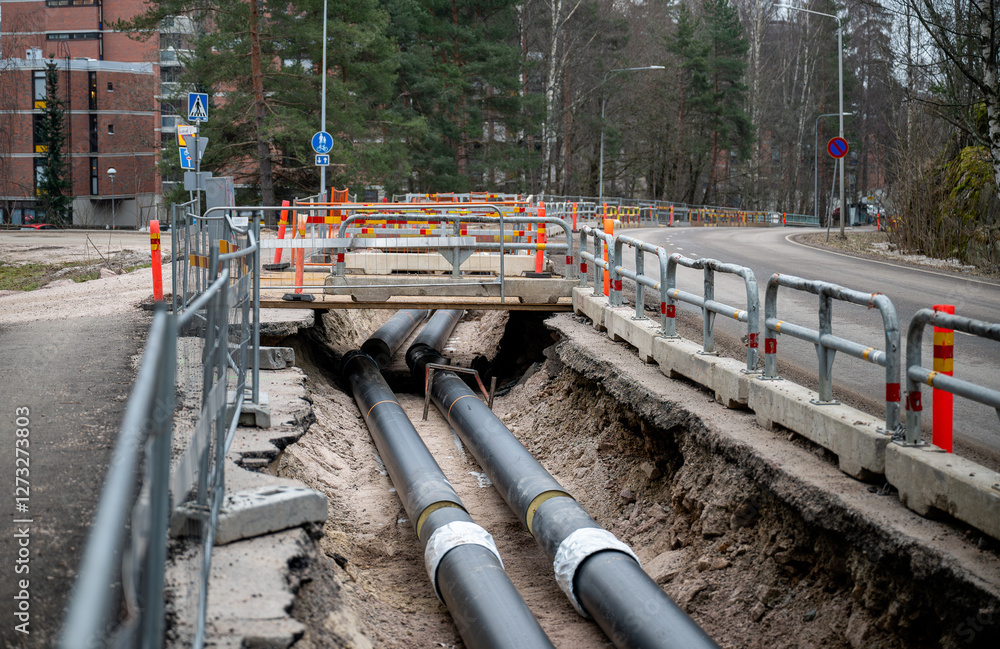 Large black underground pipes being installed in an excavated trench at a construction site, surrounded by dirt and gravel, with safety barriers