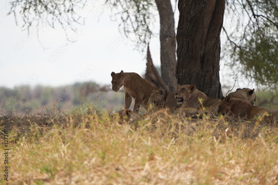pride of lionesses laying under a tree in tarangire national park tanzania, wallpaper, grass