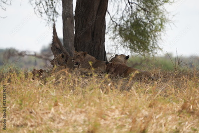 pride of lionesses laying under a tree in tarangire national park tanzania, wallpaper, grass