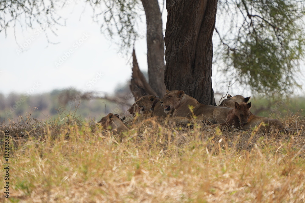 pride of lionesses laying under a tree in tarangire national park tanzania, wallpaper, grass
