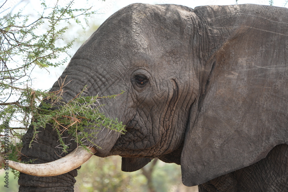 Close-Up of African Elephant Browsing on Acacia Tree – Safari Wildlife in Natural Habitat
