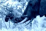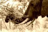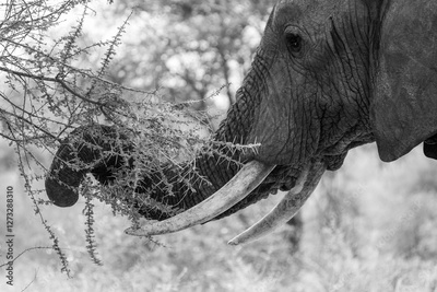 Close-Up of African Elephant Browsing on Acacia Tree – Safari Wildlife in Natural Habitat - black and white greyscale