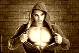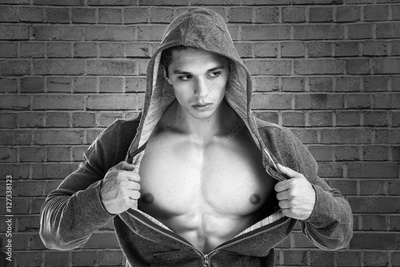 Bodybuilder Muskeln Mann stark muskulös jung Jacke schwarzweiß