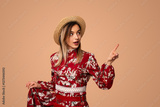 Confident young female model with blond hair in floral dress and straw hat pointing aside and looking away against beige background