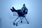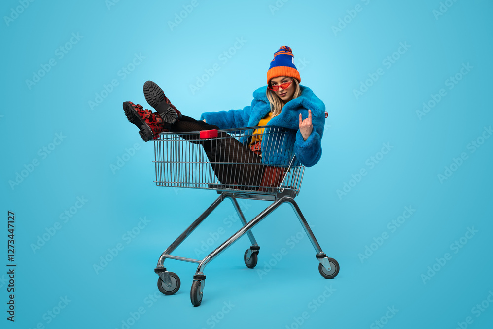 Insane female dapper in bright outfit looking at camera while riding trolley during shopping against blue background