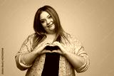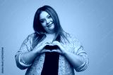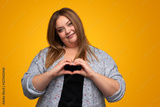 Positive plump young female in casual outfit showing heart gesture with hands expressing love and positivity on yellow background