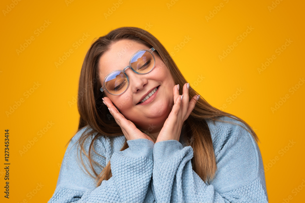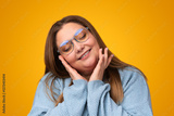 Positive young overweight female in glasses smiling and touching cheeks against yellow background