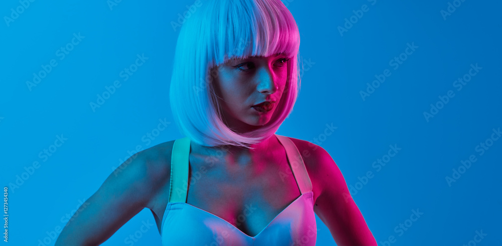 Futuristic young female in wig looking to the side standing under neon light against blue background