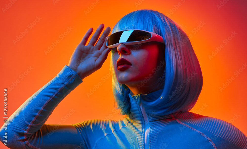 Futuristic female robot in digital goggles touching glasses controls while standing against orange background