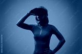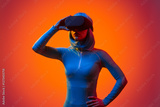 Young female in VR goggles wearing futuristic clothes with blue hair against neon orange background