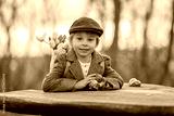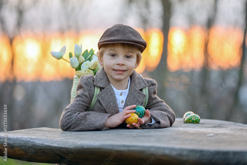 Beautiful stylish toddler child, boy, playing with Easter decoration in the park, springtime