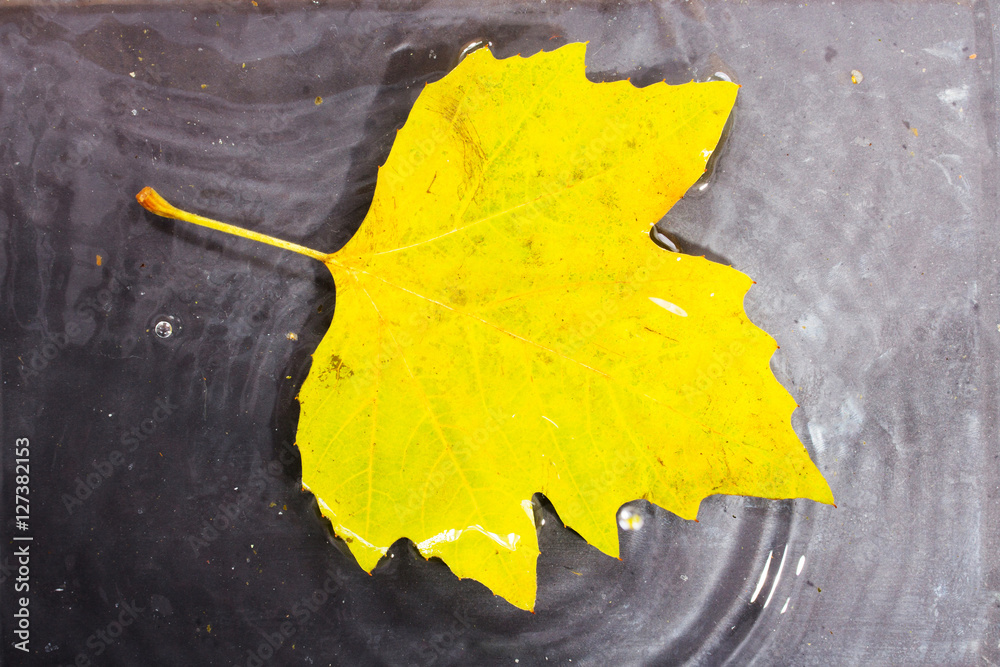 Bright colourful autumn leaf floating in water