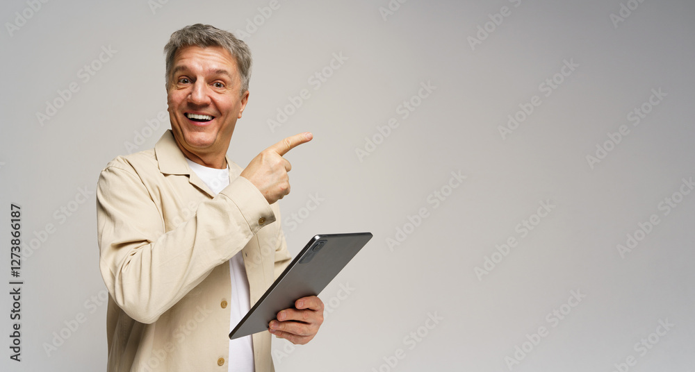 Man in beige jacket smiles and points while holding a tablet in a neutral background room