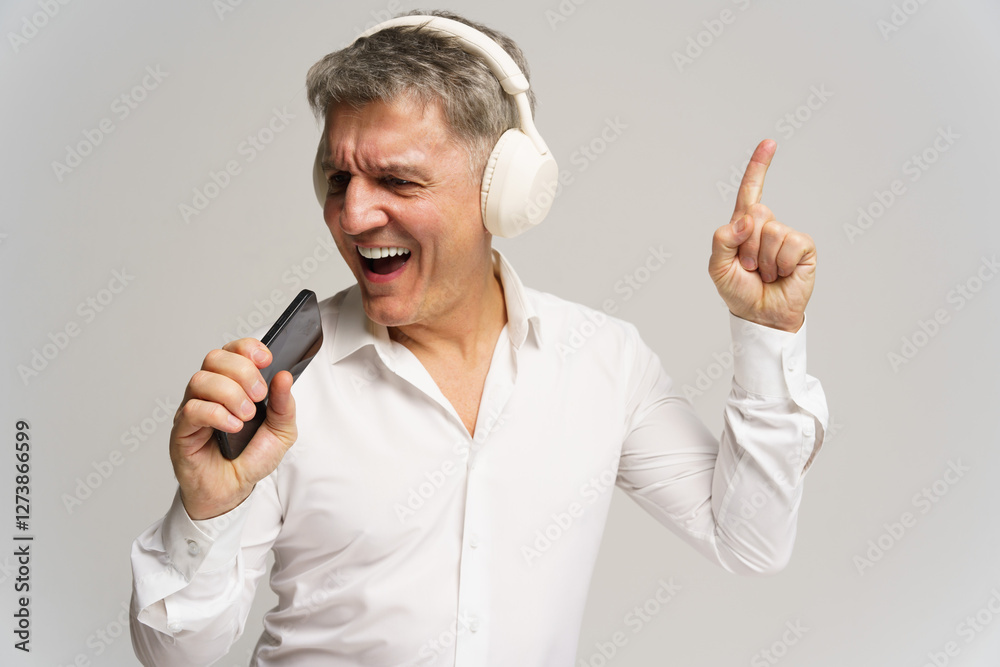 Man enjoying music with headphones and singing passionately while holding a phone indoors