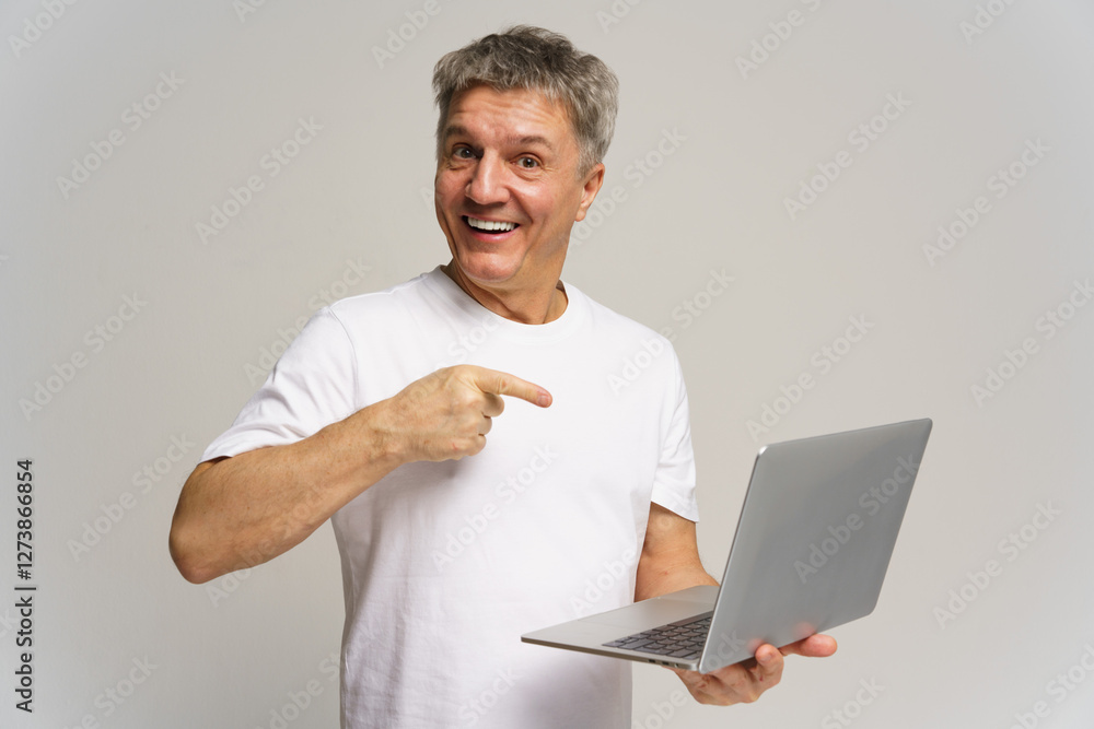 Happy man holds a laptop and points at it with a smile in a neutral background setting