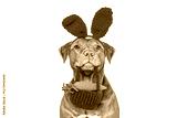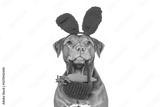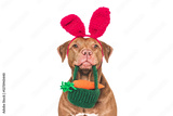 Cute dog, felt carrot and knitted bunny ears. Close-up, studio shot. Day light. Concept of care, education, obedience training, raising pet