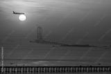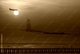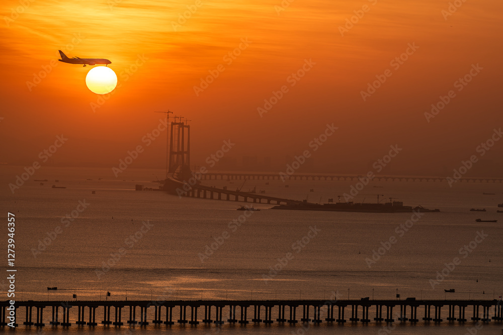 sunset over the sea with Shenzhen-Zhongshan bridge/link and plane