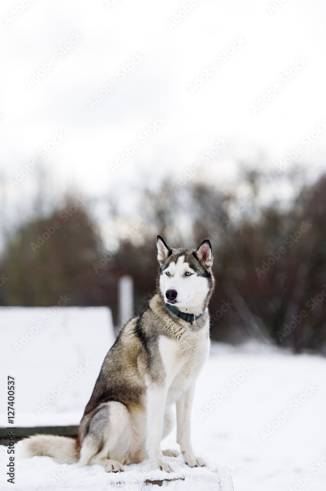 The dog Siberian husky in the winter