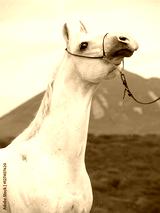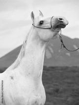 portrait of white arabian stallion at mountain background