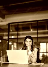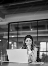 Smiling middle aged 40s professional business woman in office, portrait. Happy mature mid age professional businesswoman executive wearing suit looking at camera at work with laptop sitting at desk.