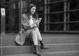 Businesswoman using smartphone and drinking coffee outdoors