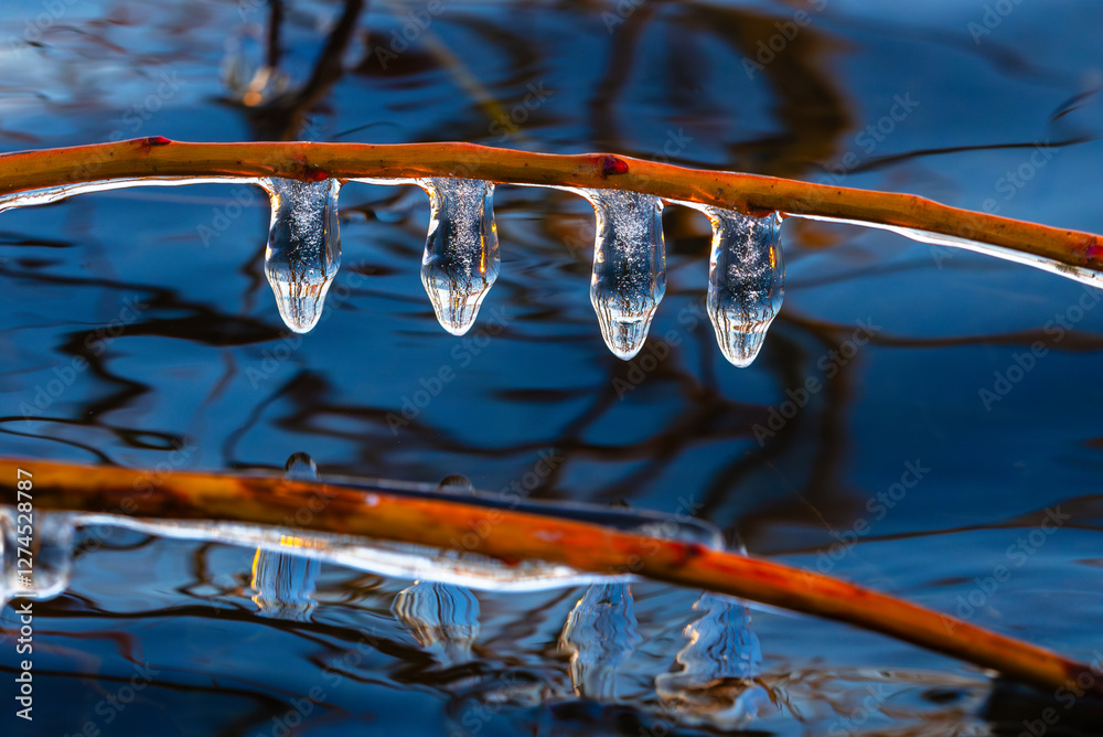 Icicles Gracefully Hanging from a Branch Above Calm and Tranquil Water Surface Nearby
