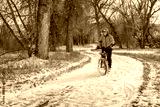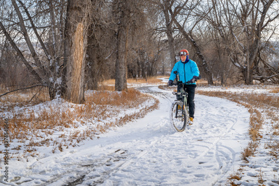 senior male cyclist is riding a touring electric bike on Poudre River Trail in northern Colorado, winter scenery