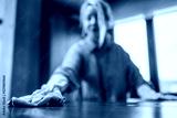 Cleaning lady wiping wooden table with blue cloth wearing yellow protective gloves