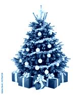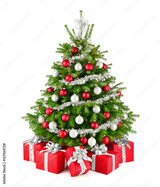Eleganter Weihnachtsbaum und Geschenke in Rot, Weiß und Silber, Freisteller