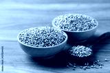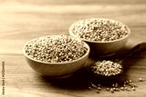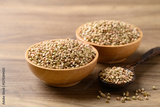 Organic buckwheat seed in wooden bowl with spoon, Food ingredient