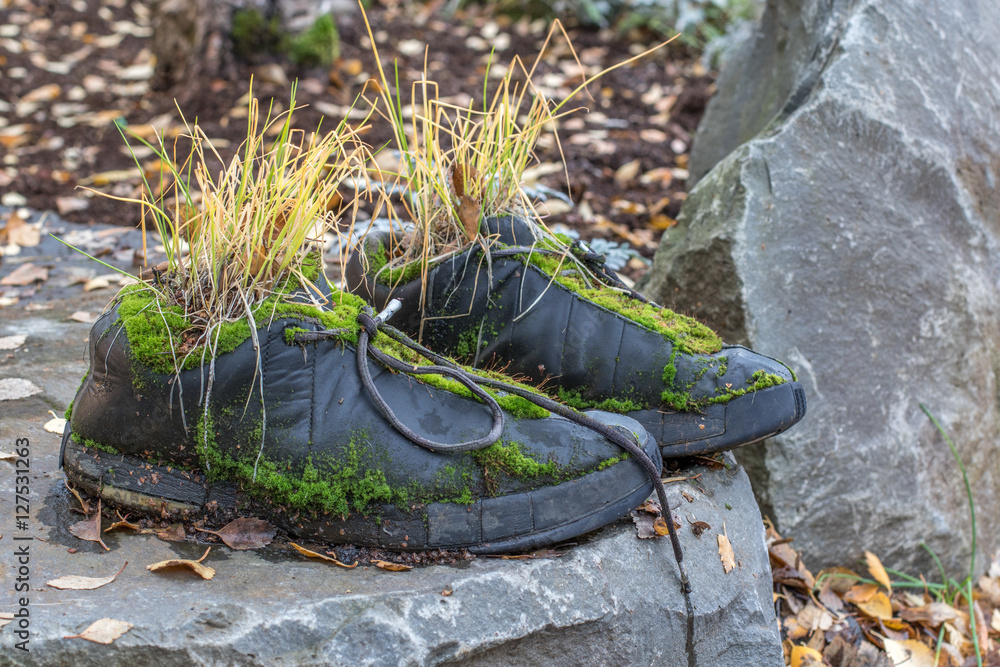 Grass and moss growing in old pair of shoes. Nice outdoor garden decoration