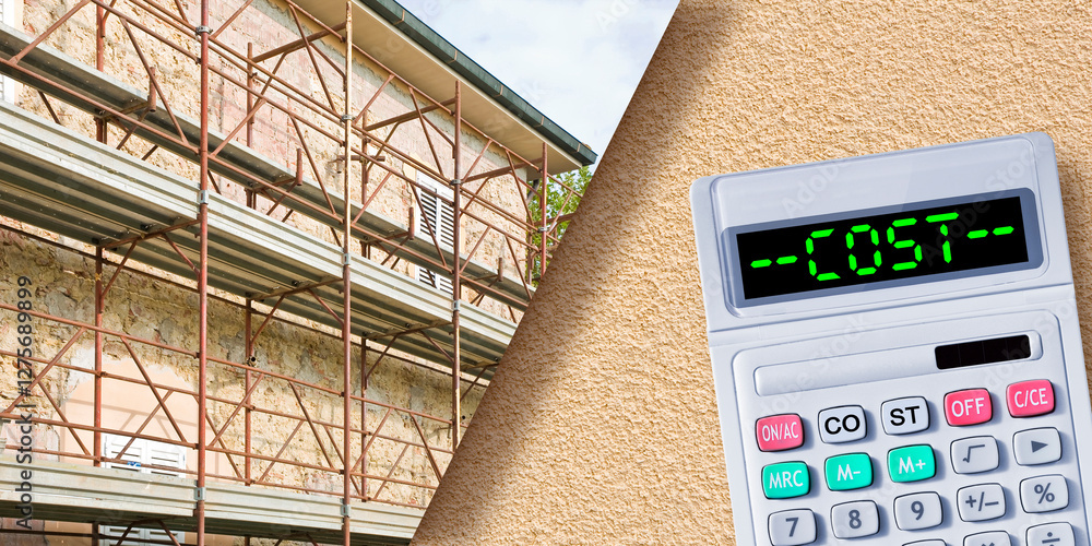 COSTS FOR REPLASTERING THE FACADE OF A BUILDING - Removing old plaster from a wall and replacement with new plaster - Construction work on a building site with security metal scaffolding