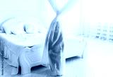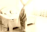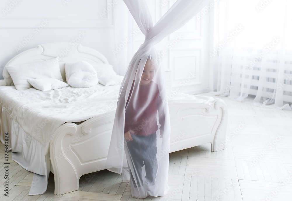 The little boy has hidden for a curtain in big light bedroom.