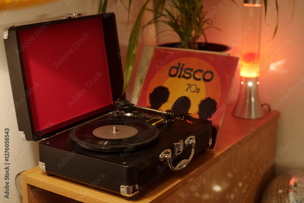 Classic turntable playing a vintage vinyl record with a disco album in background, creating nostalgic ambiance and warm lighting enhancing retro aesthetic