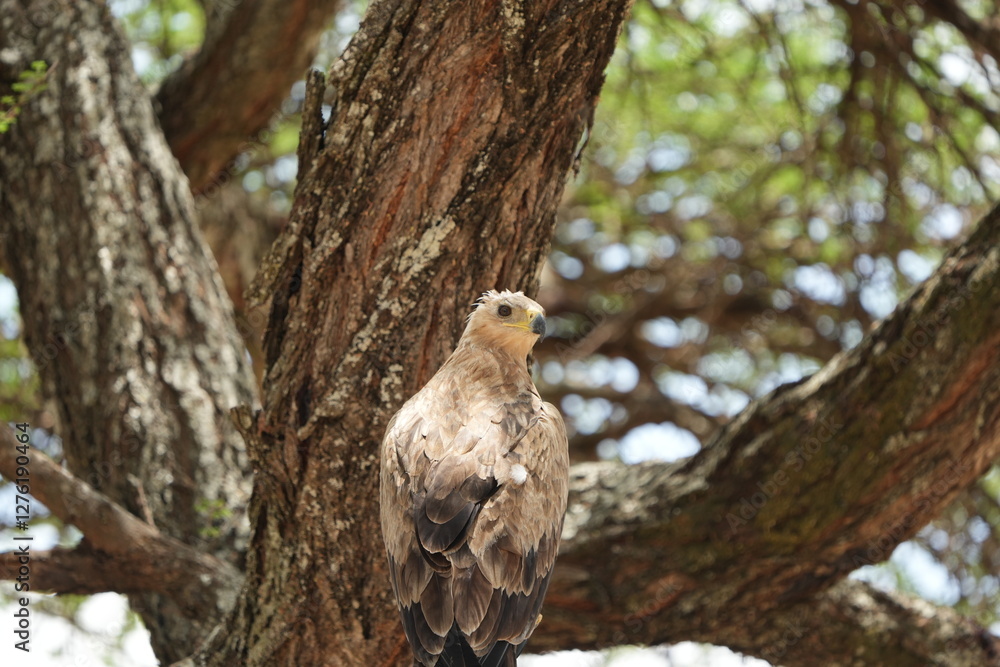 Tawny Eagle Vigil: A Majestic Sentinel of Tarangire - Portrait and Wallpaper in a tree