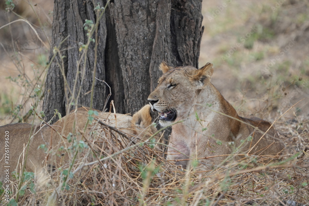 portrait of two lions chilling in the savannah of tarangire national park tanzania