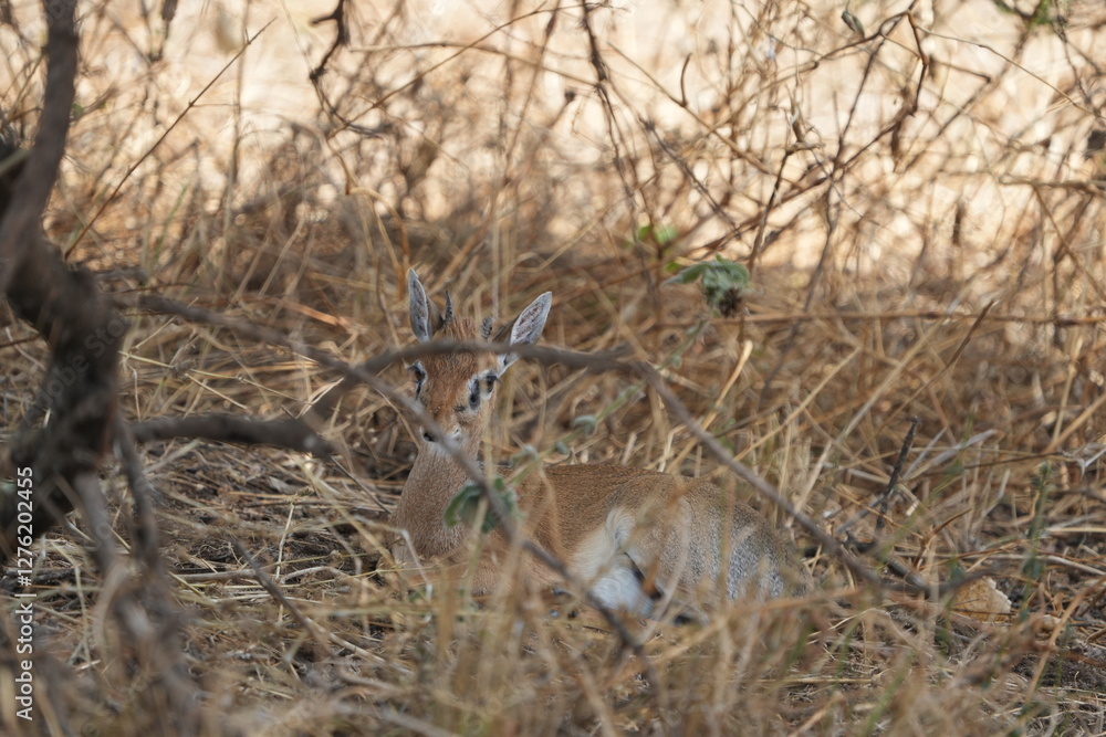 portrait of a male dikdik laying in the savannah of the tarangire national park tanzania