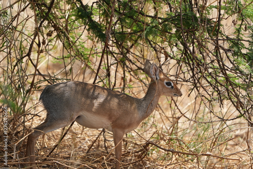 portrait of a female dikdik standing under a tree in tarangire national park tanzania, safari
